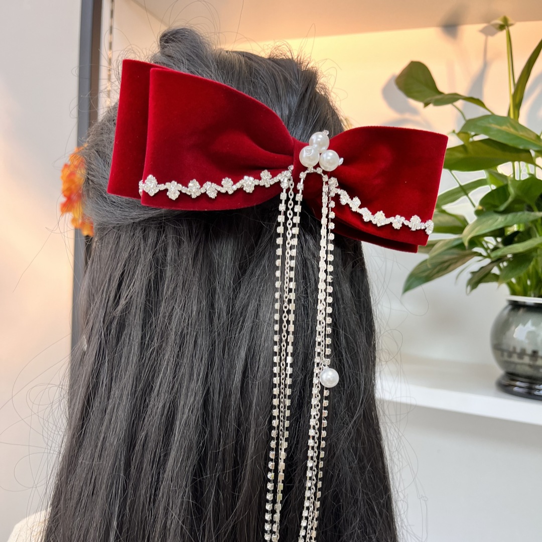 喜庆蝴蝶结头饰丝绒镶钻发夹流苏镶钻气质时尚发饰敬酒服饰
